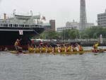 横浜 山下公園海上にて、大さん橋側より氷川丸側へ260mの距離を龍舟3艇で競います。